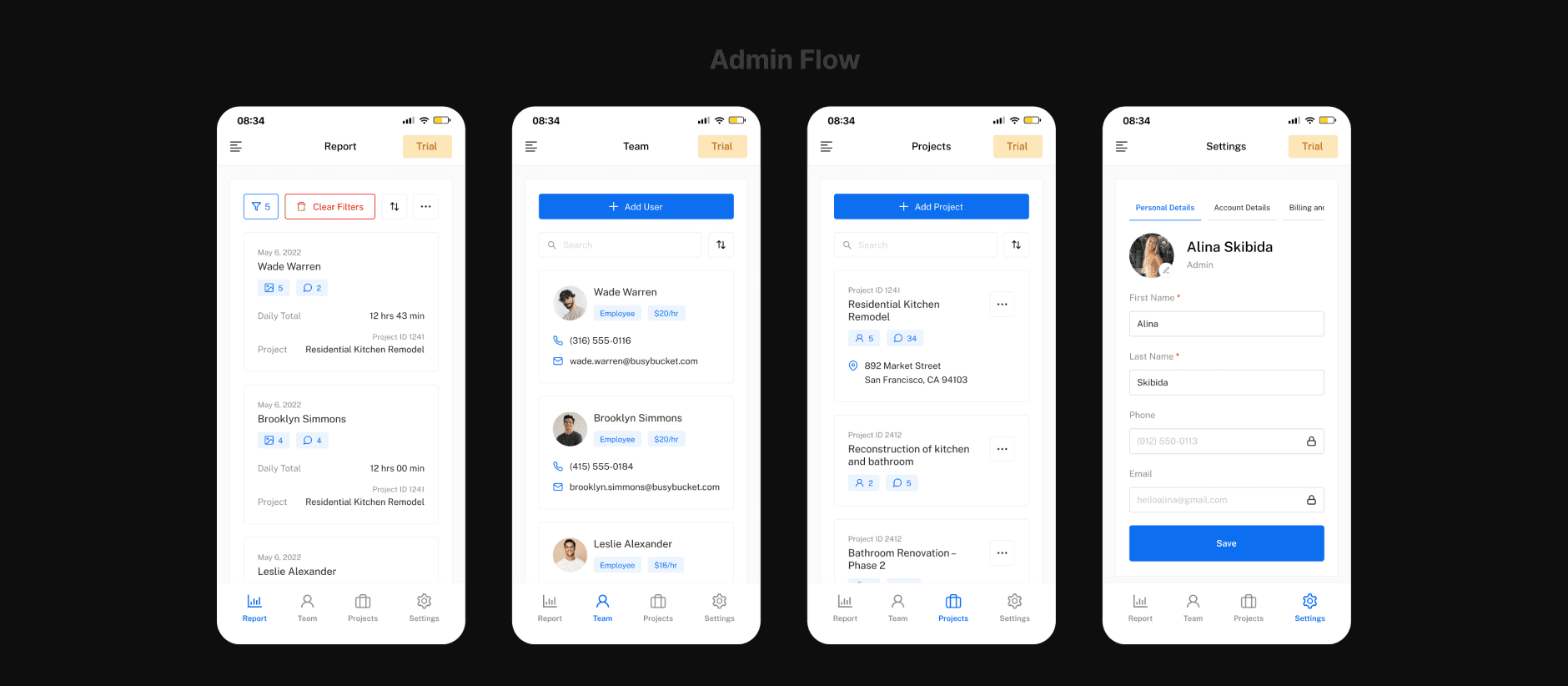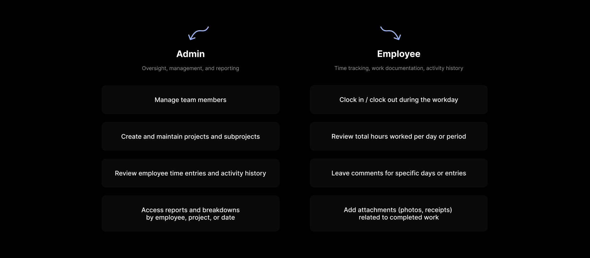The Employee experience is designed around daily work execution — logging time, adding comments and attachments, and reviewing personal activity. The interface remains lightweight and task-focused to reduce friction and cognitive load. The Admin experience is centered on oversight and coordination — managing users and projects, reviewing and adjusting time entries, and analyzing reports. The interface prioritizes structure, clarity, and efficient navigation to support more complex workflows and larger data sets.